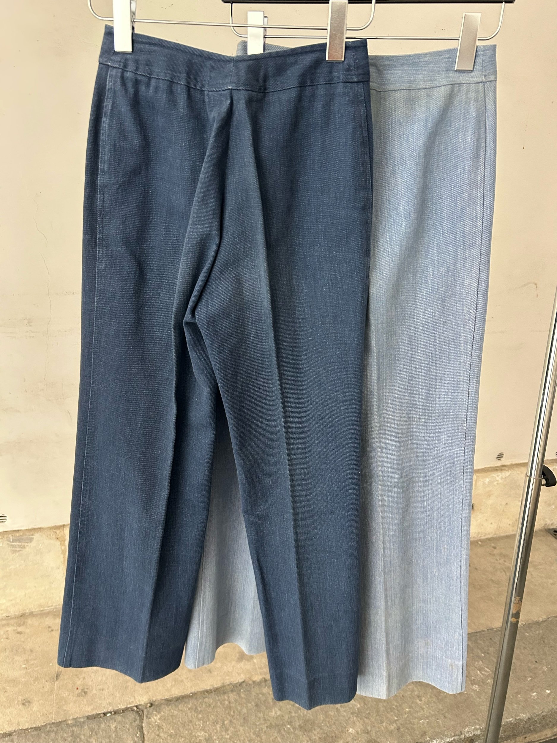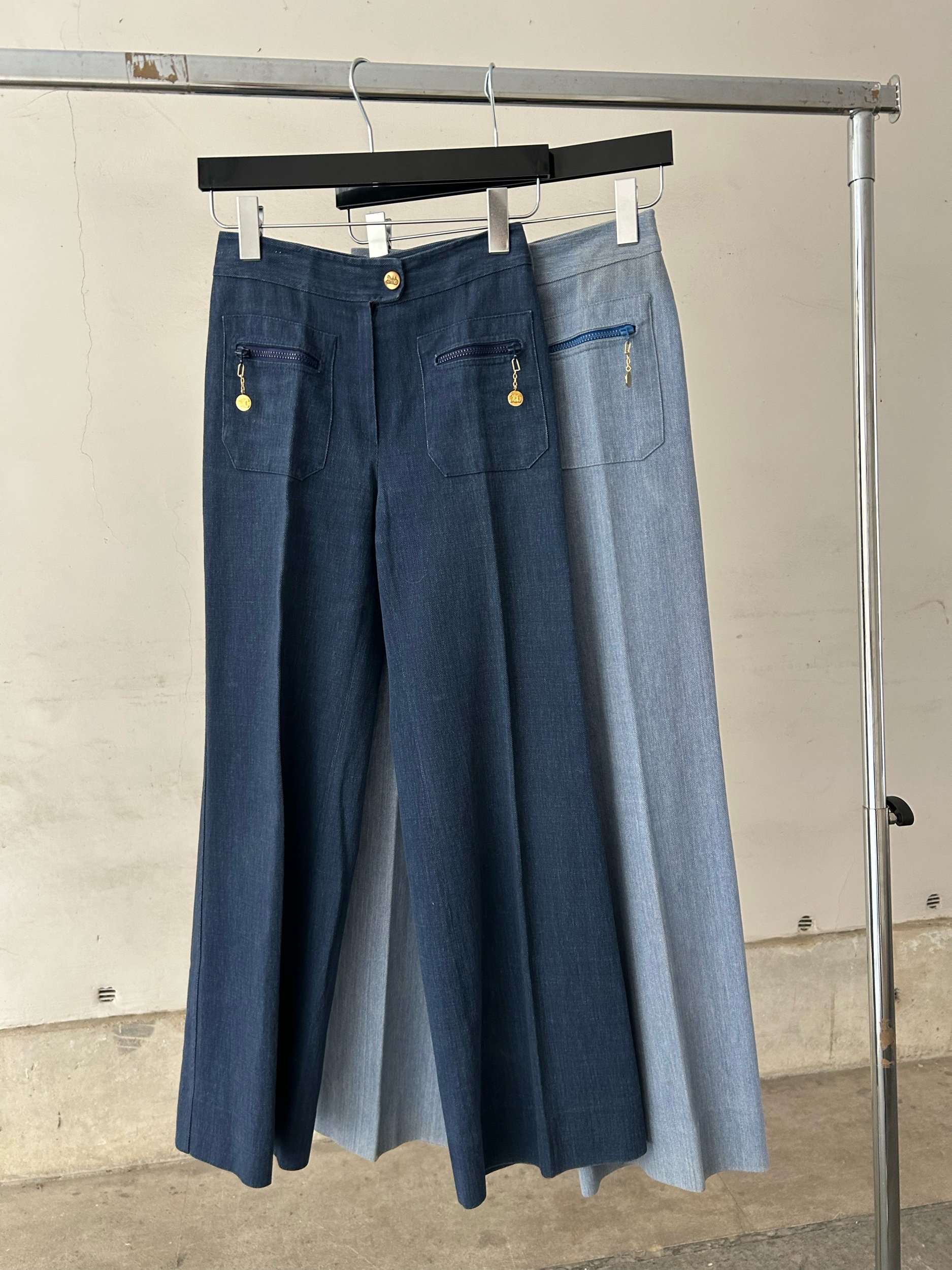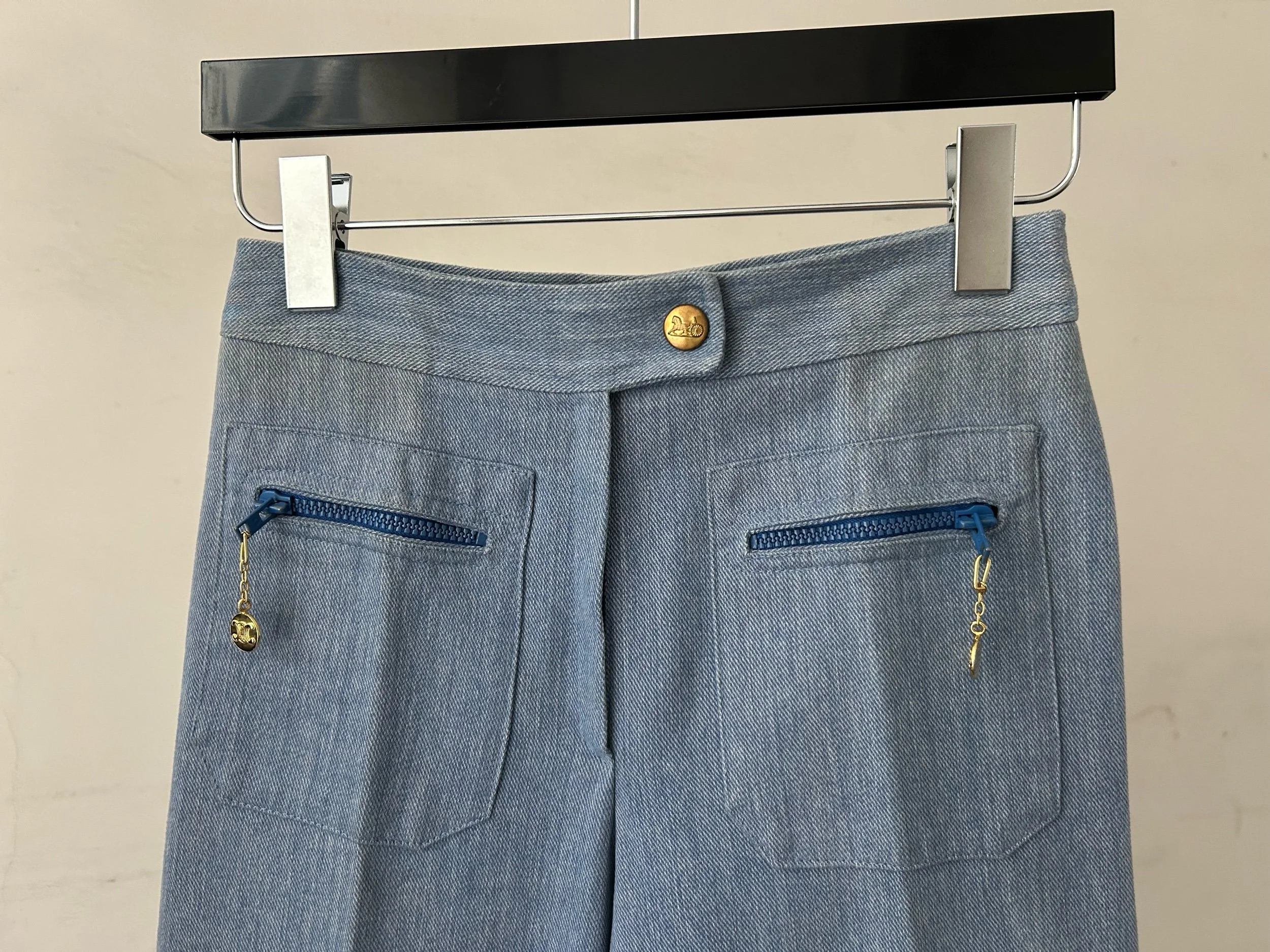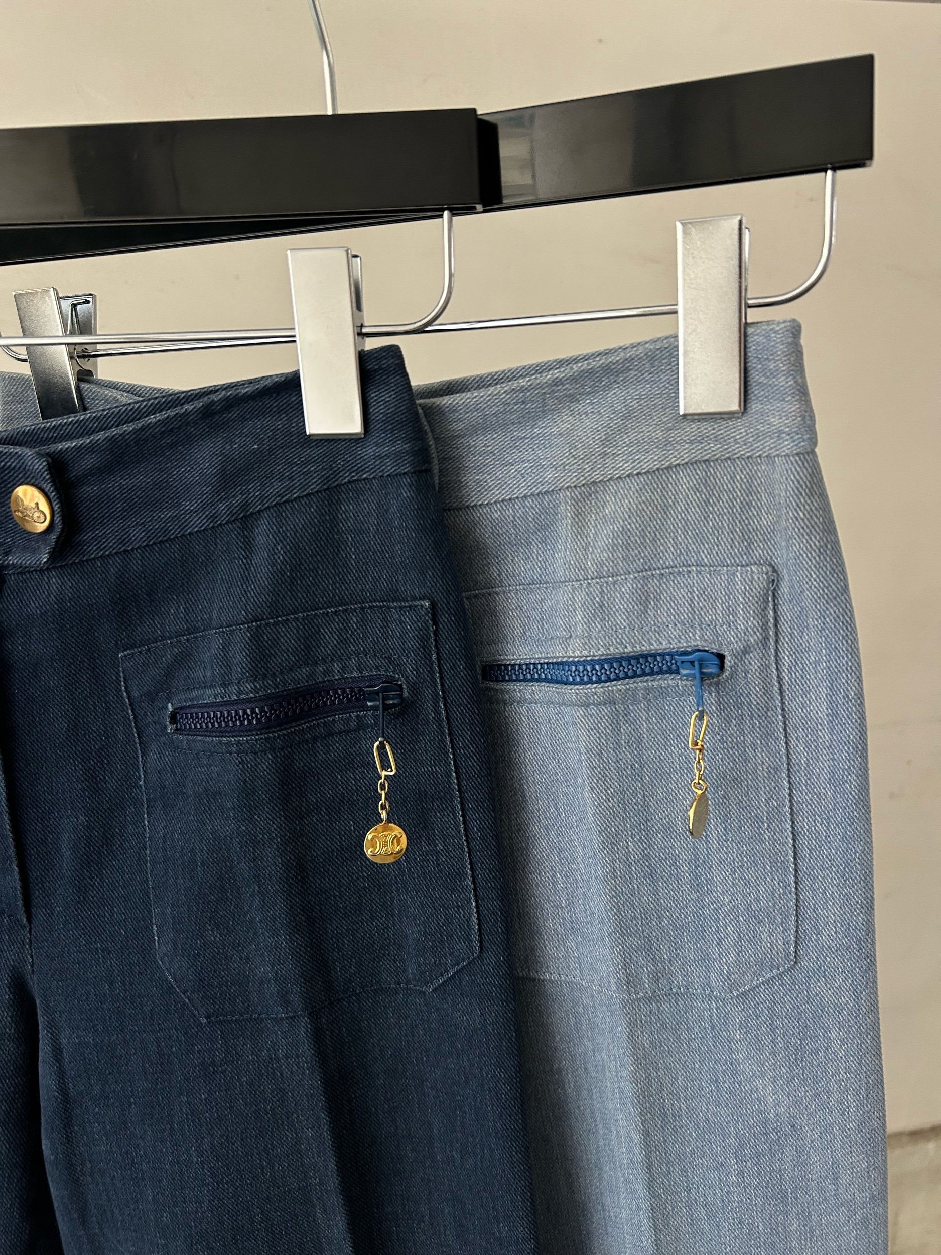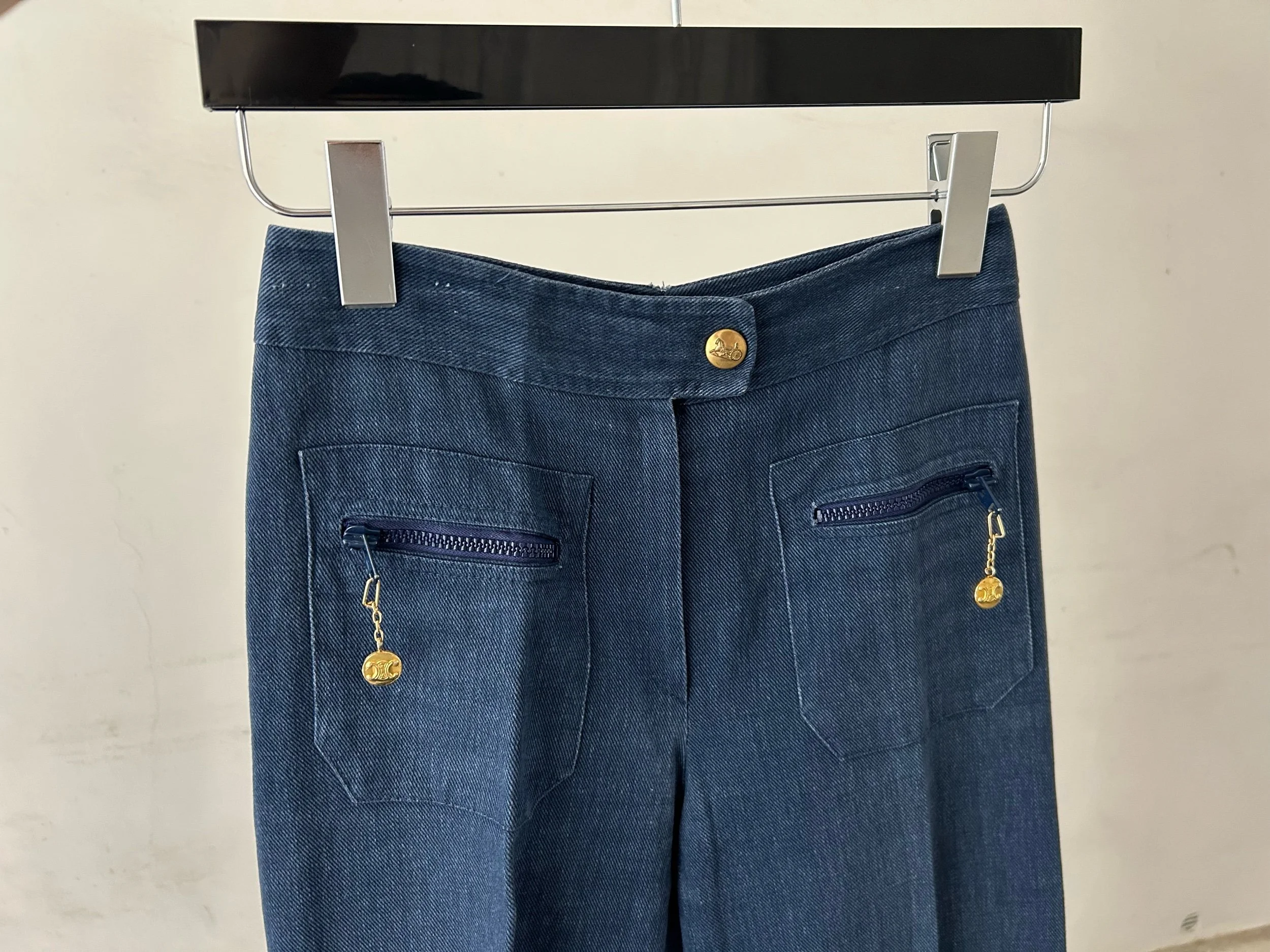 Vintage Céline trousers from the 1970s, crafted in France from structured denim. Featuring high-rise tailoring with front pleats and a discreet flare, finished with gold logo zip pulls on the back pockets. Available in light and dark indigo wash.
