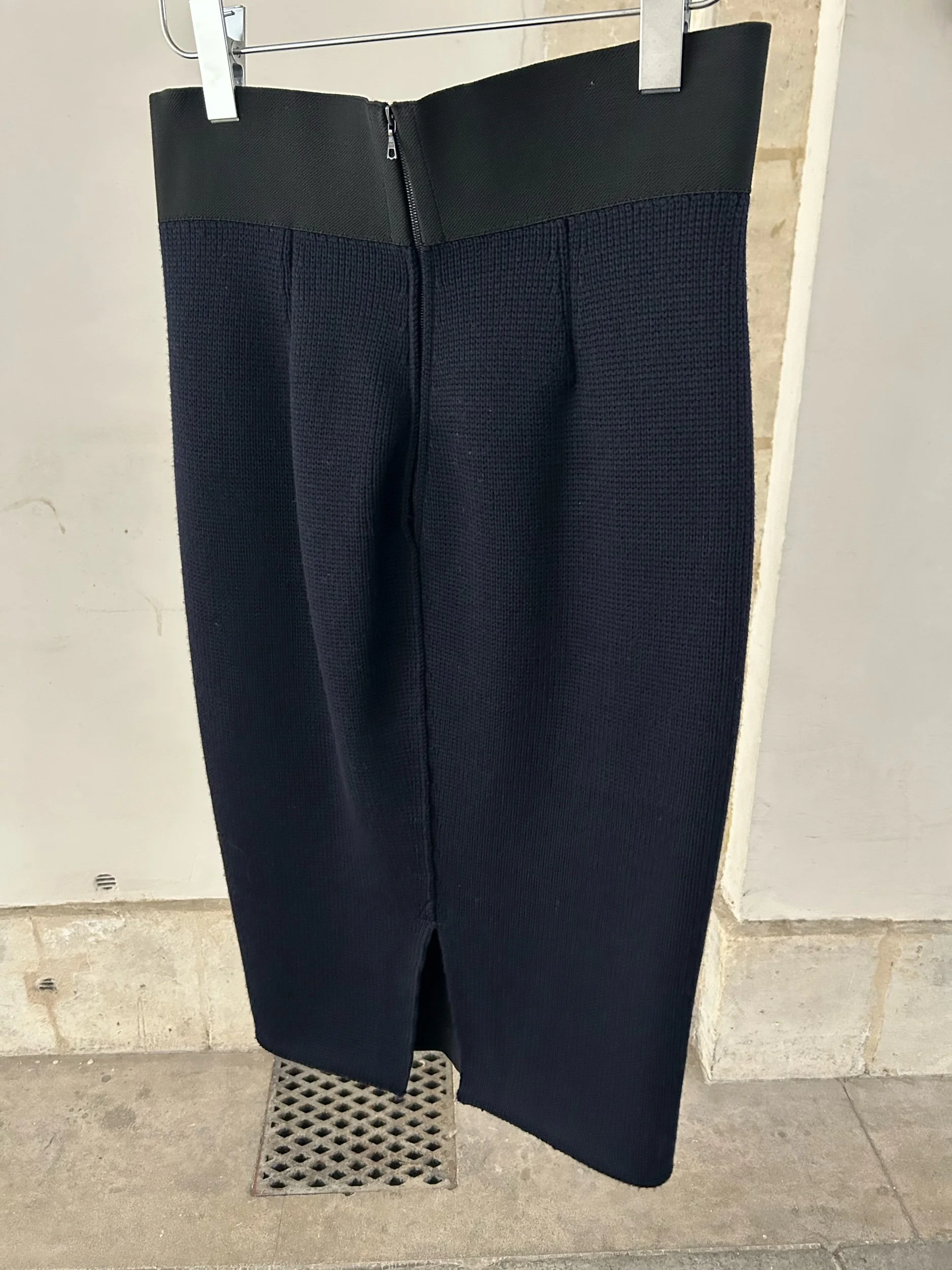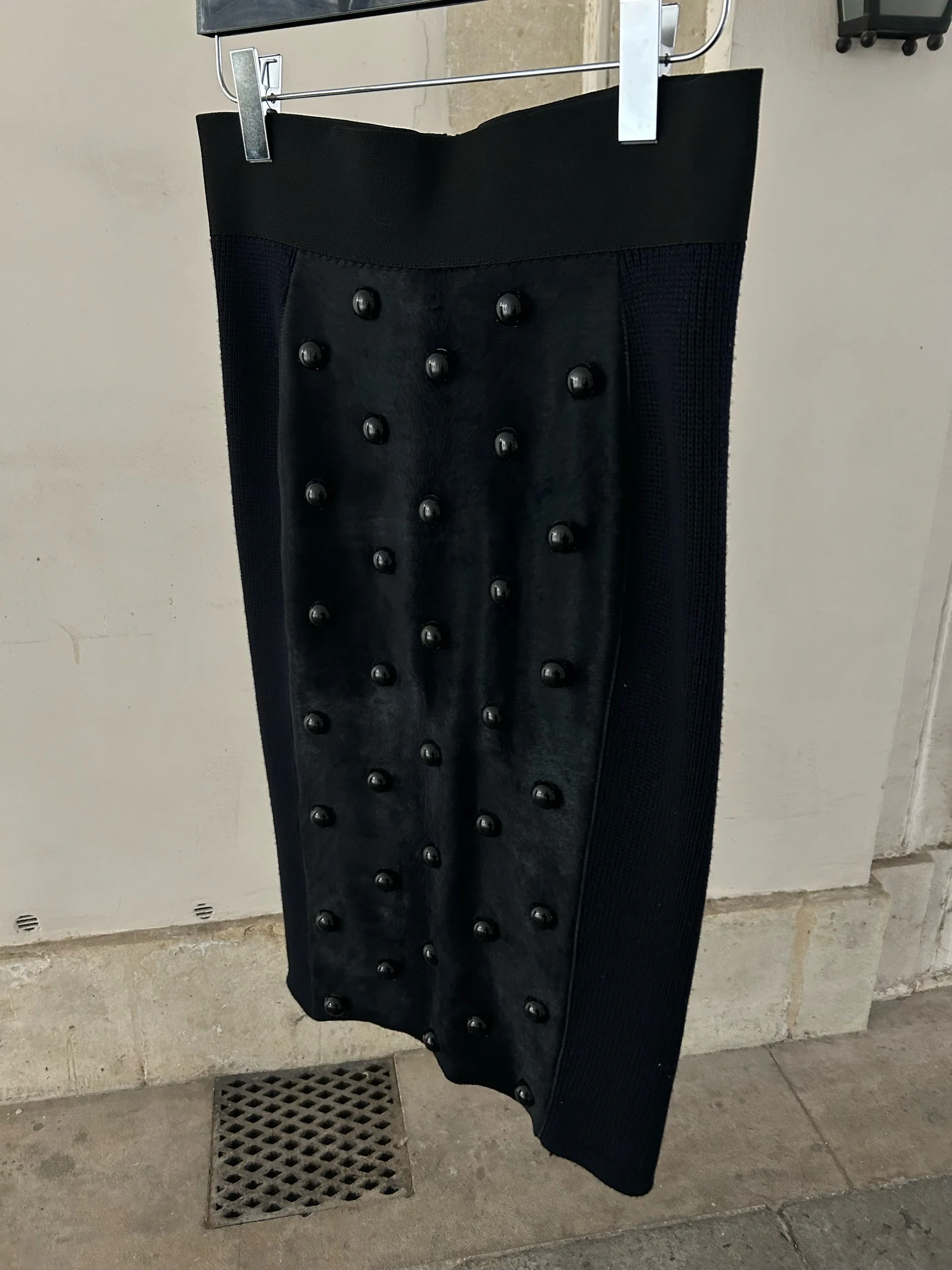 Marc Jacobs pencil skirt combining textured wool panels with a lambskin front, detailed with raised circular studs. Crafted in Italy, the design plays with volume and tactility while maintaining a sleek silhouette.