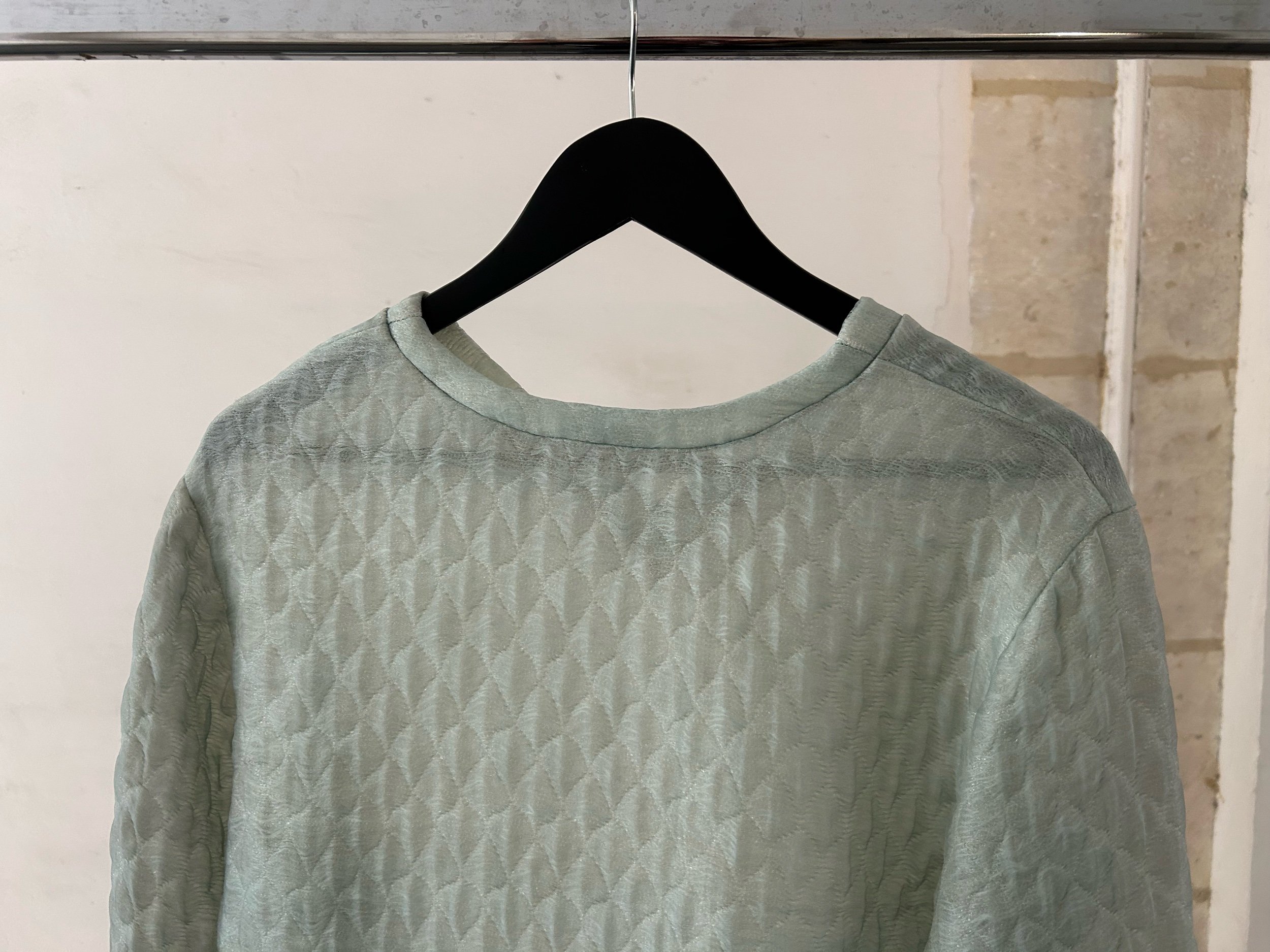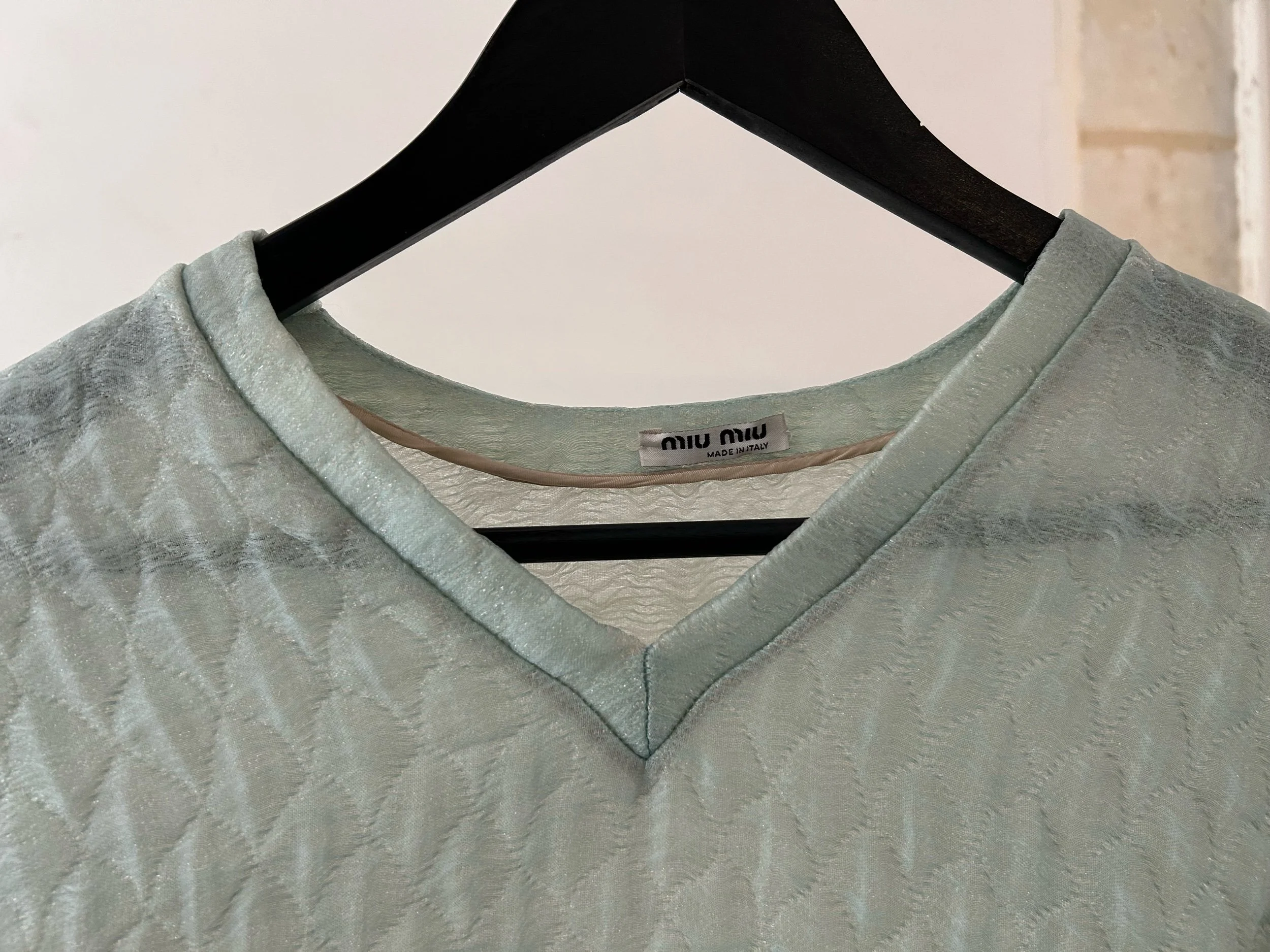 Early-2000s Miu Miu fine-gauge semi-sheer knit in almond green with subtle shimmer and geometric texture; V-neck, long sleeves, gently scooped hem. Made in Italy.