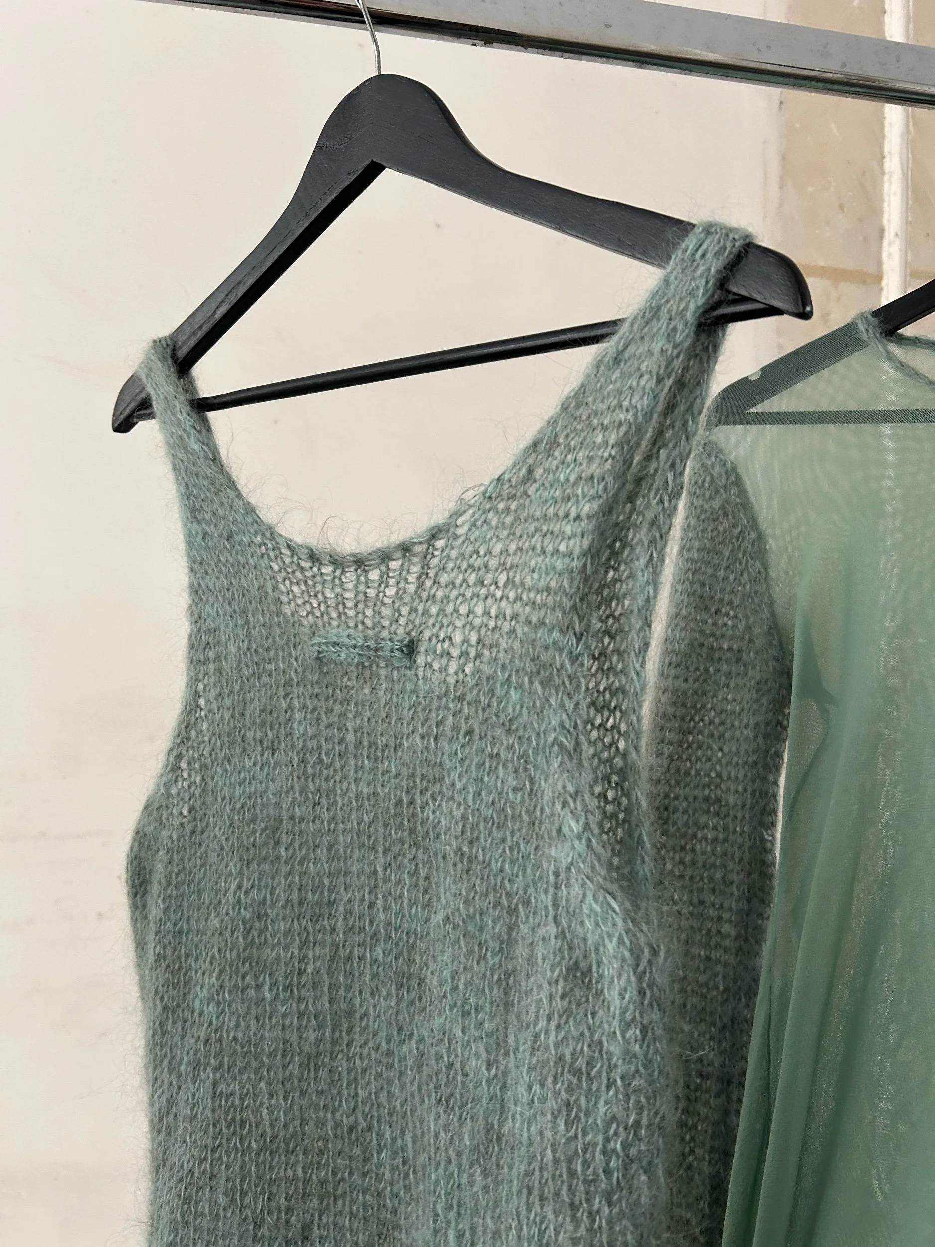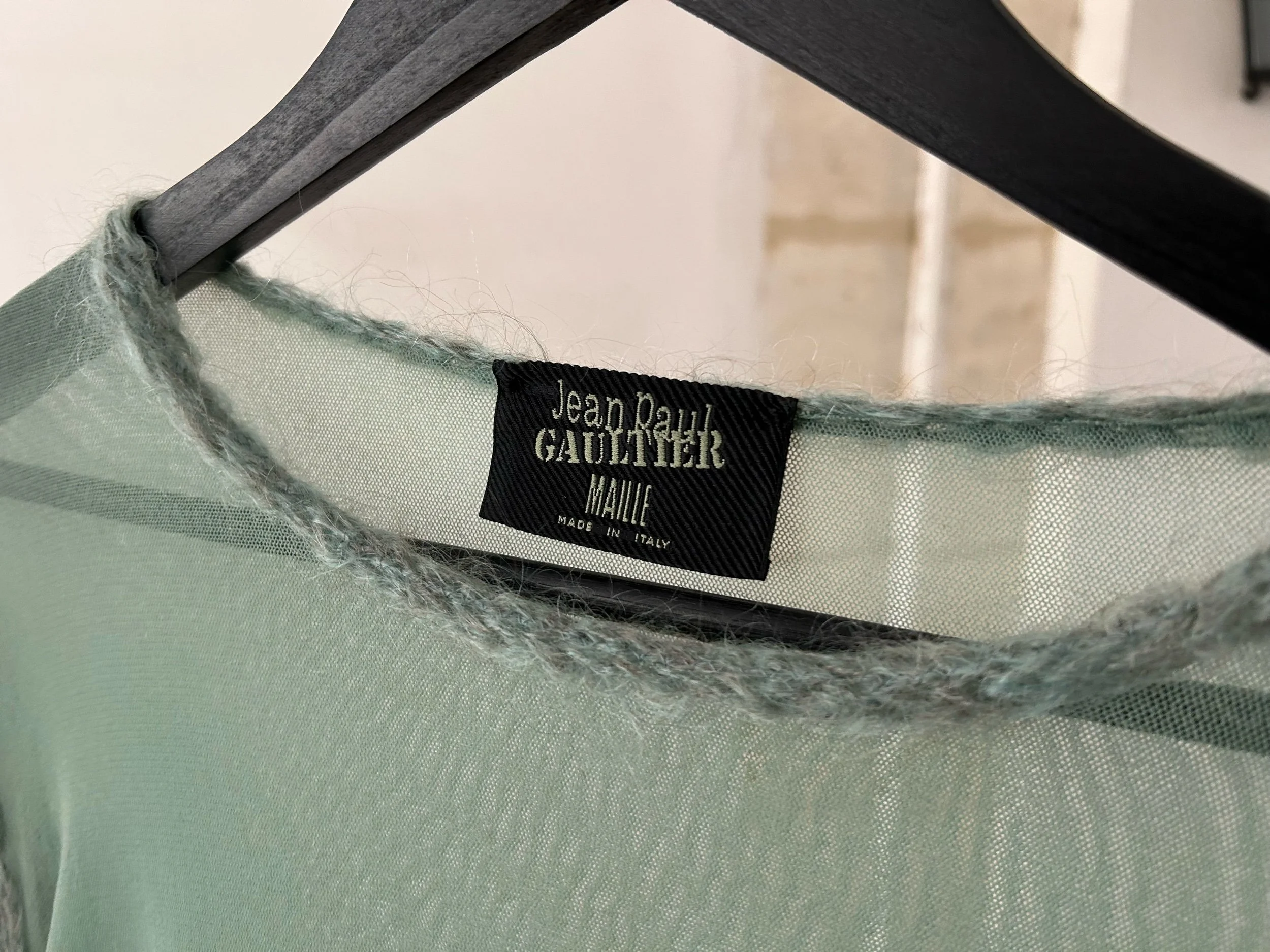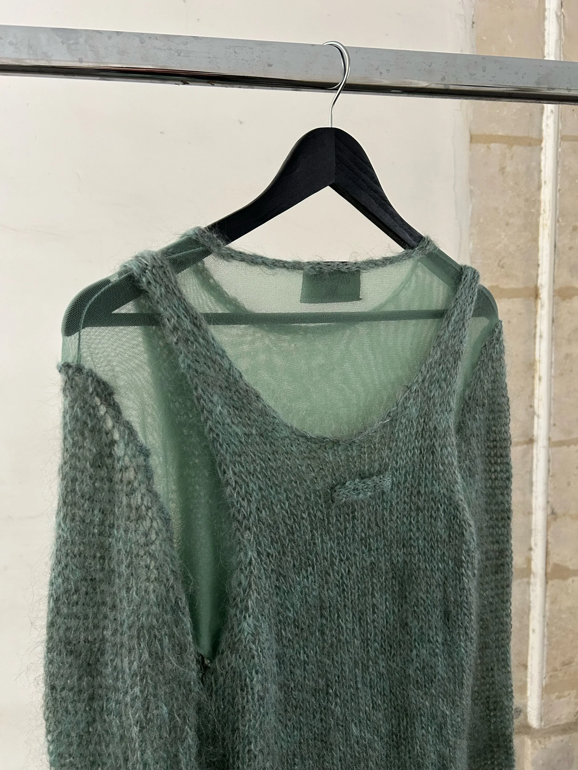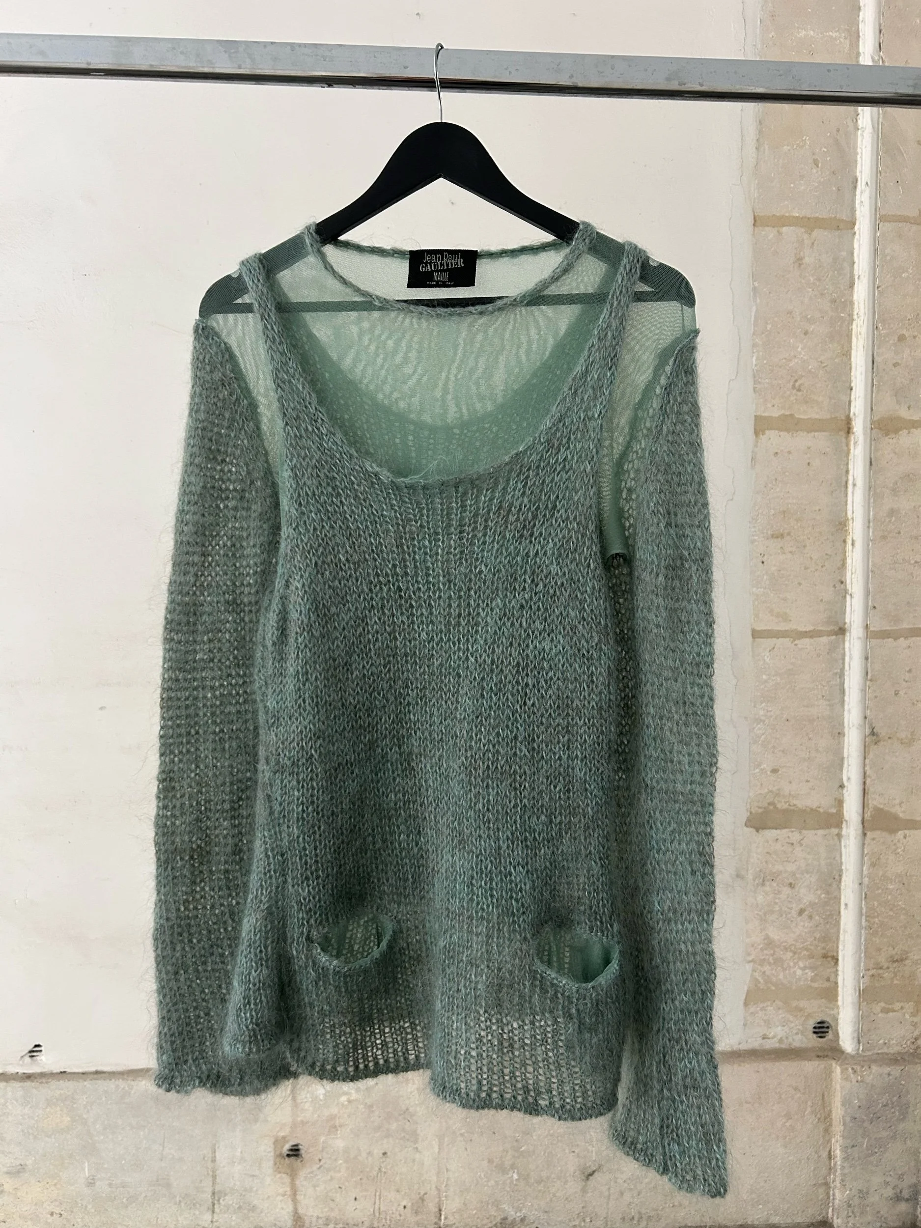 Jean Paul Gaultier Maille two-piece in almond green: airy open-knit mohair sweater with scoop neck and two small front pockets layered over a matching sheer mesh long-sleeve top. Made in Italy.